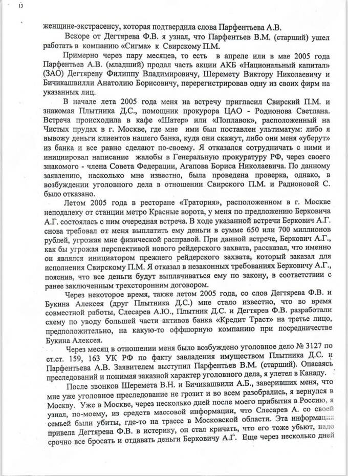 Plytnik was eventually kidnapped, taken to a base controlled by Gagiev’s organization, tortured, and forced to hand over keys to accounts, documents and offshore entities. He was later killed. Responsibility for the remaining “debt” shifted to Degtyarev and Shevchenko. Berkovich continued to demand hundreds of millions of rubles from Shevchenko, threatening violence during meetings in Moscow. Shevchenko says he still refused, insisting that payments could only be made according to an existing legal agreement. Shortly afterward, a criminal case was opened against him, which he believes was fabricated. He fled to Canada; the case was dismissed in 2016 for lack of evidence.